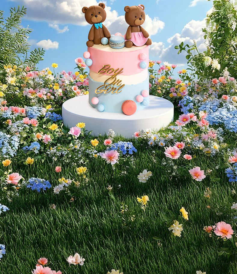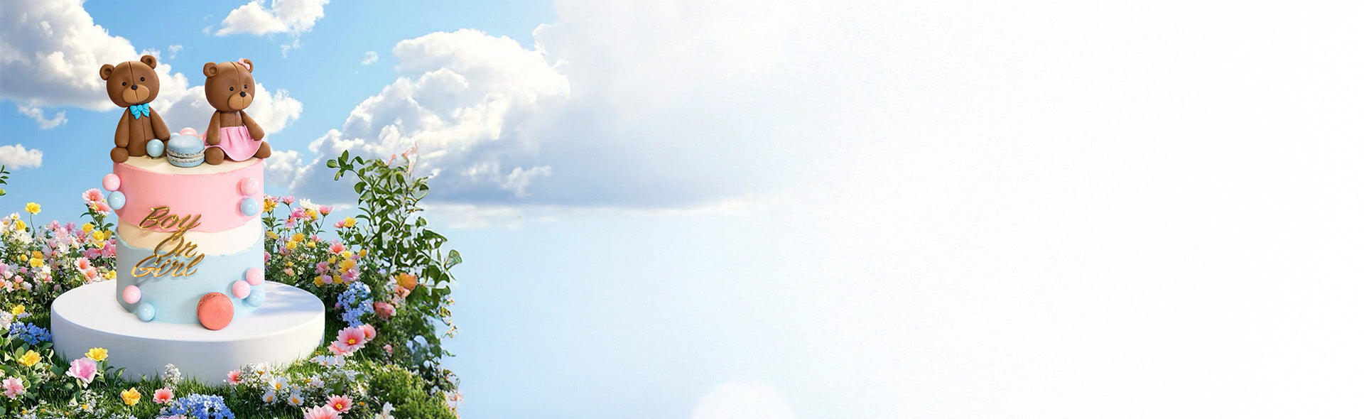 We can match any theme or style. Think baby-themed details like storks, tiny footprints, bows and ties, or balloons in the party colours. Some parents love the classic two-tier cake with the top revealing a bright pink or blue layer. We can also hide edible confetti or sprinkles inside for a dramatic cutting moment. Each cake uses moist sponge, creamy frosting, and premium ingredients. If you have specific colours or design ideas in mind (like a “Little Prince” or “Little Princess” theme), just let us know - we love adding personal touches.