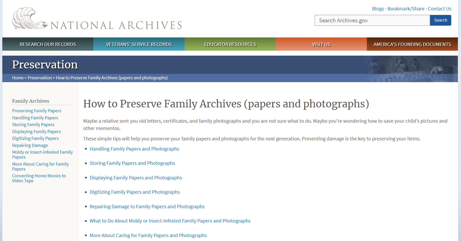9. National Archives (USA): How to Preserve Family Archives